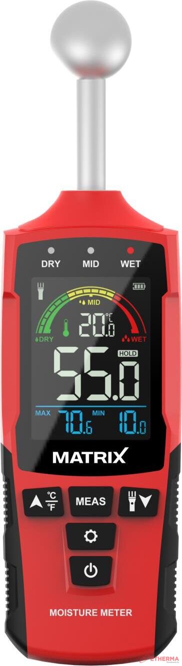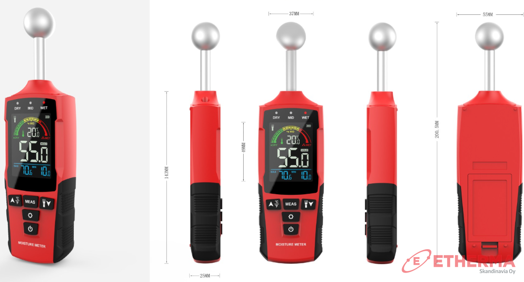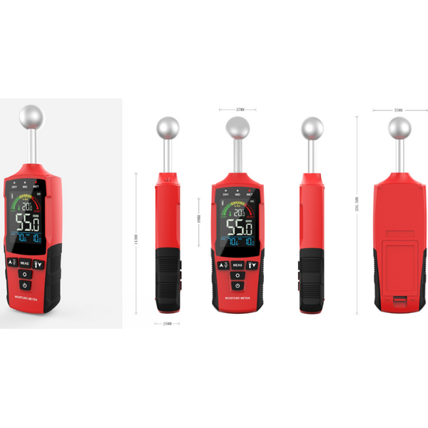 Nastaton kosteusmittari (Pallokoetin) -Rikkomaton testaus: Nastaton sähkömagneettinen anturi havaitsee kosteuden (0-80 %:n alue) vahingoittamatta pintoja. -Korkea tarkkuus: ±2 % virhemarginaali; toimii puulle, betonille, kipsilevylle, kaakeleille ja kipsille. -Kestävä ja kompakti: ABS+PC iskunkestävä runko -Kirkas näyttö: Taustavalaistu LCD-näyttö, jossa on värikoodatut hälytykset (vihreä/keltainen/punainen).